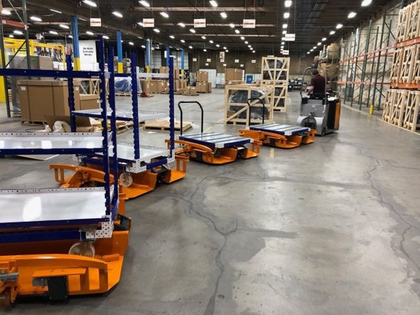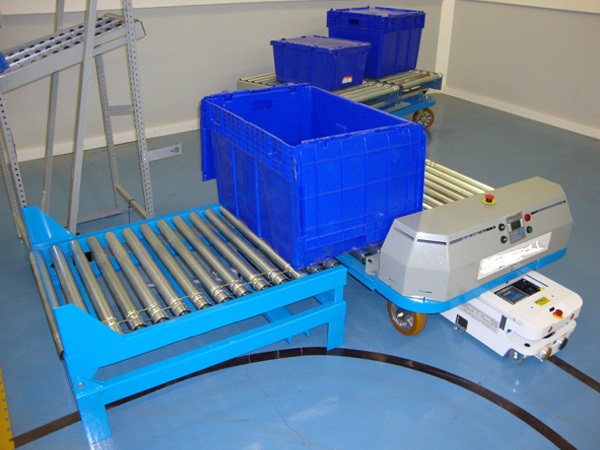 We have created various automatic transfer carts for various size totes or bins to be delivered to work cells and manufacturing lines.