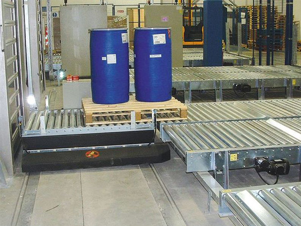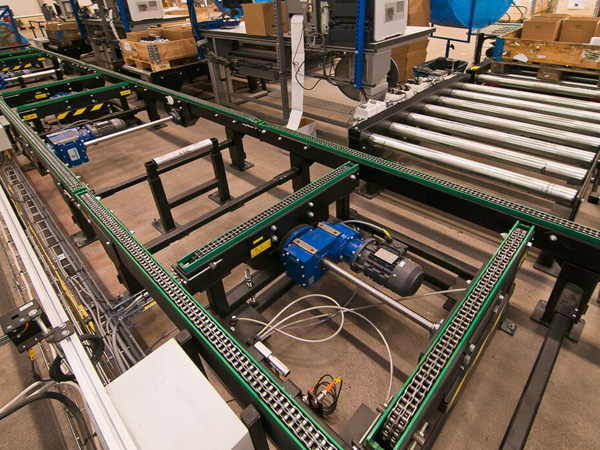 Chain transfer conveyors are used to move pallet of product to an adjacent or parallel conveyor line. Air bags or electrically driven screws lift the transfer mechanism while powered chains transfer the product.
