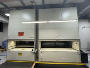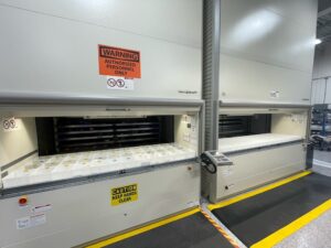 Optima Machinery USA Corporation located in Green Bay, WI is a sales and service center for their German OEM parent company. Optima manufactures packaging machinery for a wide range of industries including liquid/granule consumer products, nonwoven products and pharmaceutical products. A traditional storage rack system which consumed 2,000 square feet of floor space was being pushed to capacity, complicating order picking and creating bottlenecks in shipping. “We are growing rapidly. Our inventory and shipping needs far out-paced our warehousing methods,” said Vince Hecht, Facility Manager at Optima. “That’s what lead us to search for a storage unit to take advantage of vertical space, which gives us more efficient storage and retrieval of parts.”