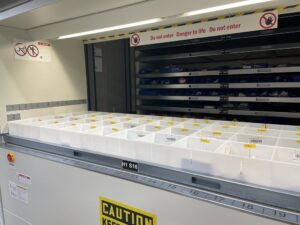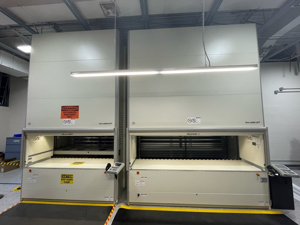 Solution: Wolter, Inc. completed an inventory study/count with quantities and dimensions of every part and product in the system. It was determined that Optima would most benefit from the removal of the entire existing system of shelving and drawers, replacing them with a Hanel Lean Lift, an electrically powered vertical lift module.