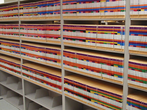 Instead of putting files in drawers, they are placed onto shelves, allowing for more vertical space to be utilized for storage. Typically, this style of shelving requires less than half the floor space of traditional file cabinets through better utilization of your vertical space. To help keep your important records organized and accessible, we also provide filing systems, folders and label printing.